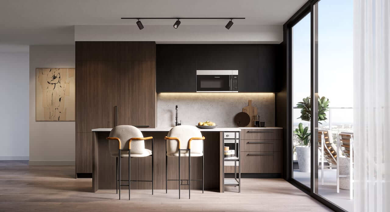Suite Finishes: High Smooth Ceilings, Wide Plank Engineered Wood Flooring, Floor-to-Ceiling Windows, 8 ft Tall Suite Doors, Designer-Curated Custom Kitchens, Quartz Countertop and Backsplash, Soft Close Cabinets and Drawers System, Premium Six-Piece Appliance Package, Full-Size Washer & Dryer, Luxurious Porcelain Tiles, Smart Home Thermostat and Smart System