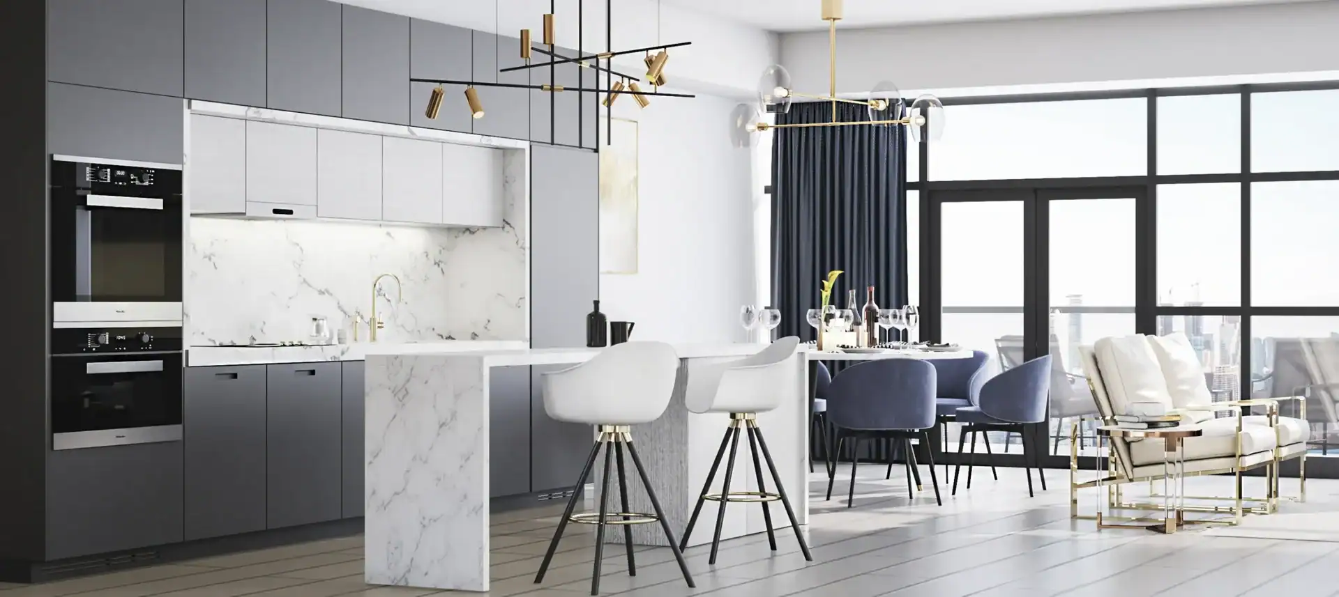 Suite Features: Large Balconies & Terraces with gas line, 8′ Doors, 10′ Ceilings, Italian MUTI kitchen cabinets, Miele fully integrated kitchen appliances, Granite or Quartz Kitchen Countertops, Wide-Plank Engineered Hardwood Flooring, Frameless Glass Showers in Ensuite, Smart Home Features, and more