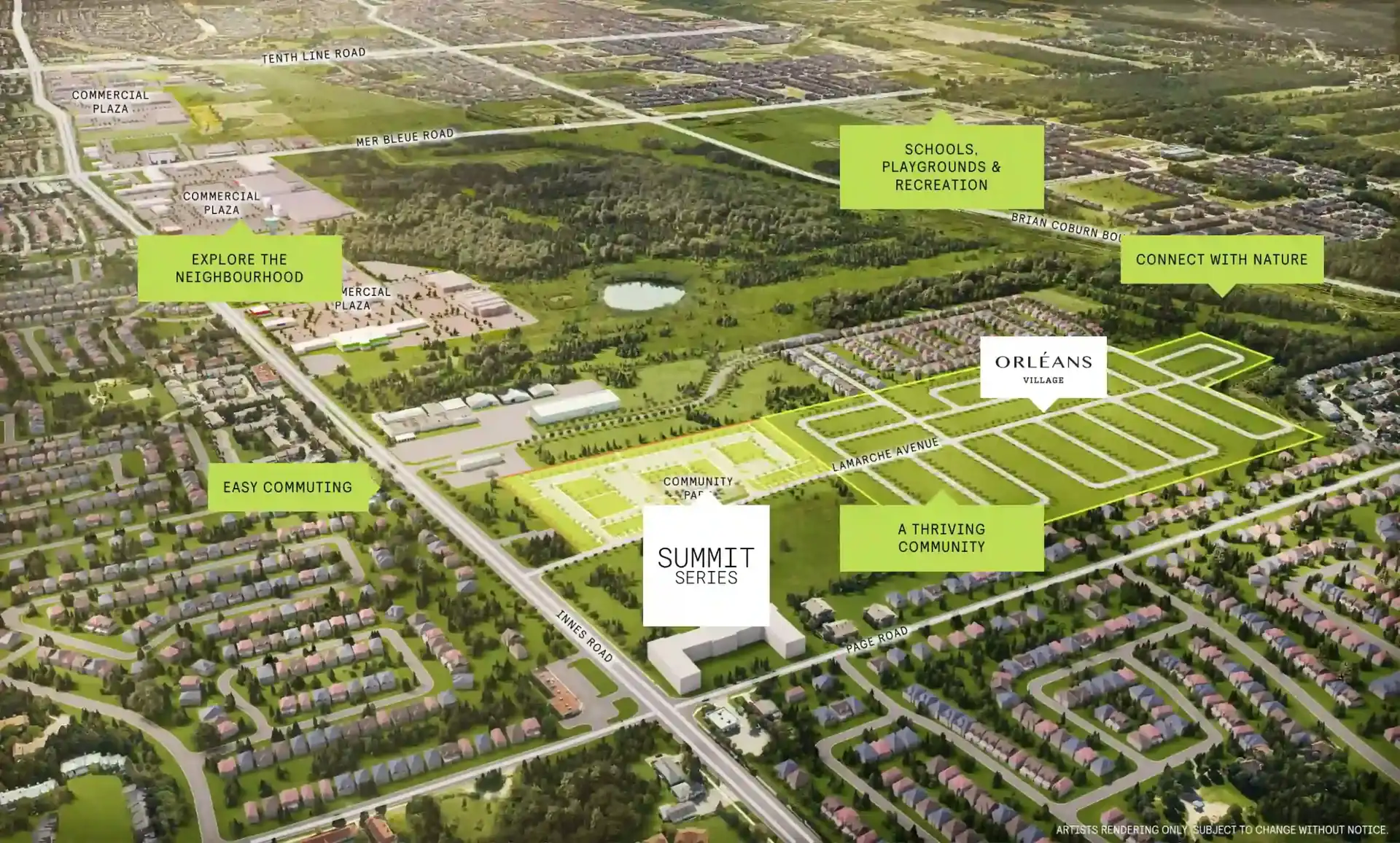 Introducing The Summit Series Towns, the newest addition to join the Orléans Village Master-Planned Community in east Ottawa! Located near Innes Rd & Orléans Blvd, Orléans Village offers the perfect blend of convenience and natural beauty. With quick access to public transit and Highways 417 & 174, commuting to downtown Ottawa is effortless. Along Innes Road, residents will find a variety of Big Box Stores, local shops, restaurants, fitness studios, and entertainment venues. Orléans Village also boasts ample green spaces, including a 16-acre pond and over 100 acres of trails and parkland, offering an ideal setting for outdoor activities and connecting with nature.