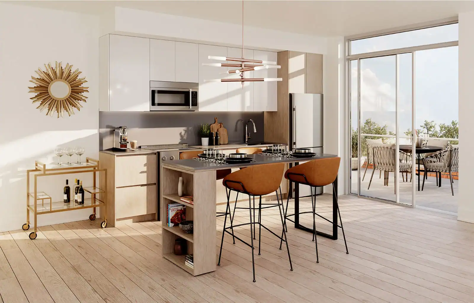 Suite Finishes: Laminate Flooring, Stone Kitchen Counters, 4″ Stone Backsplash, Stainless Steel Kitchen Appliances, Stacked Washer & Dryer, Sliding Clear Glass Bedroom Door