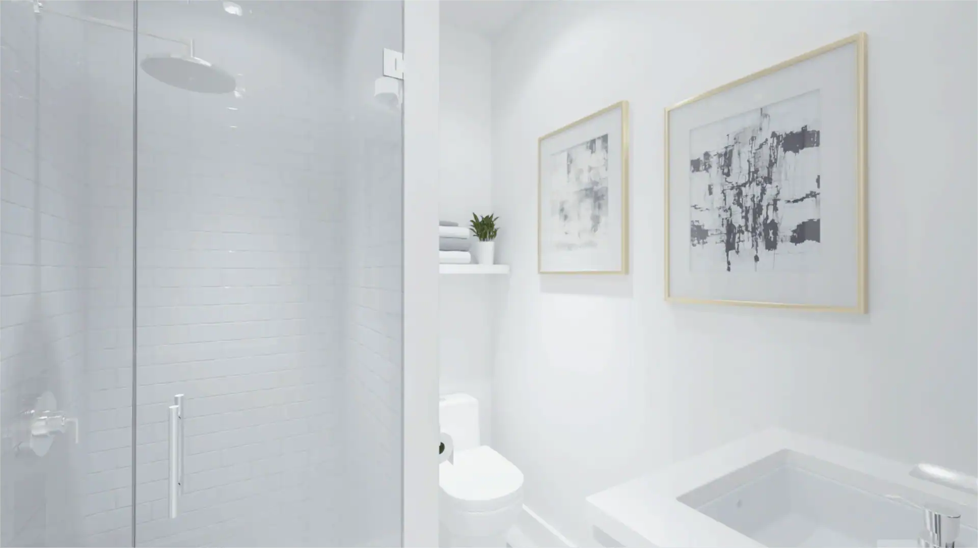 bathrooms will include sleek designed cabinetry, wide 12 x 24 inch tile, frameless glass shower enclosures and polished chrome accessories
