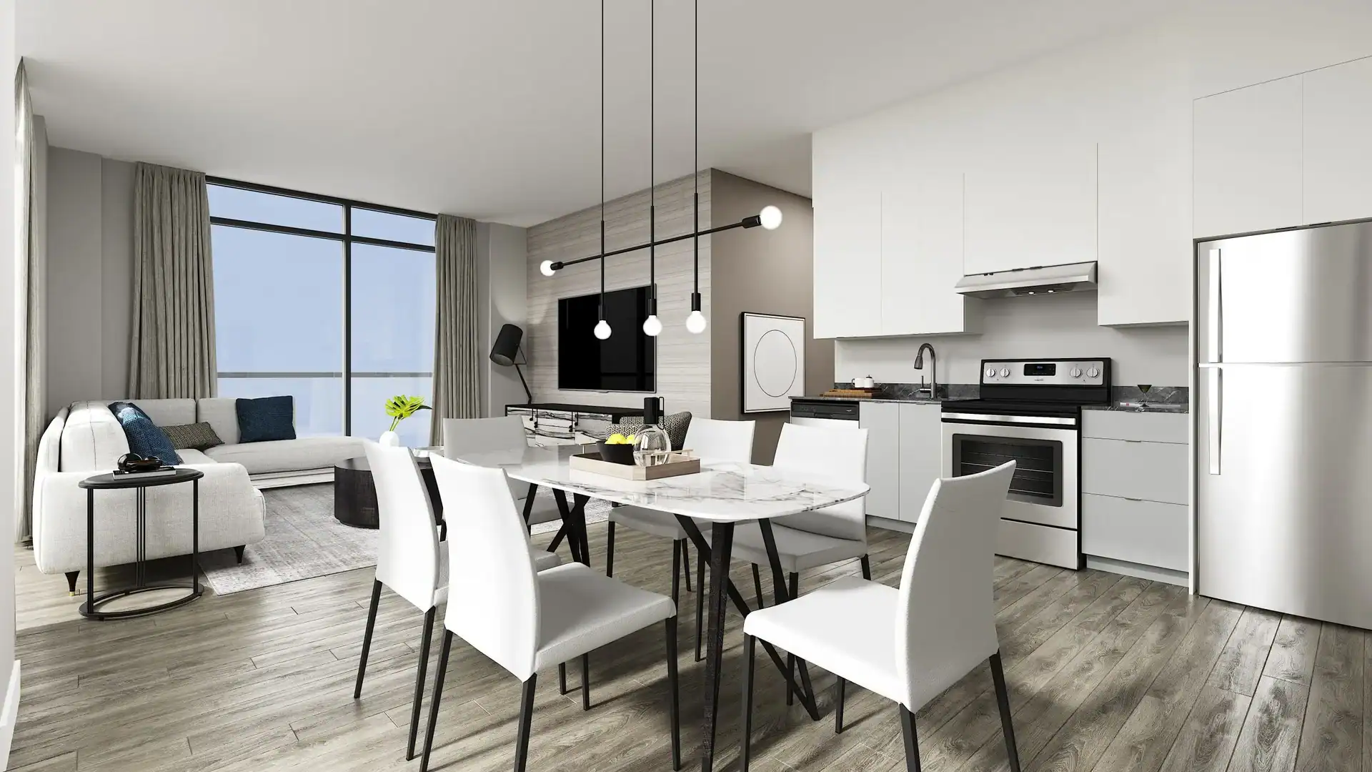 Features & Finishes: Wide Plank Laminate Floating Floors, Lush Carpets in Bedrooms, Stackable Washer & Dryer, Quartz Kitchen Countertop, Stainless Steel Fridge, Electric Range & Dishwasher and more